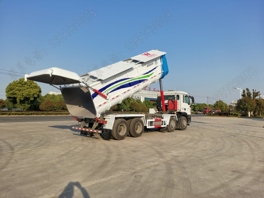 箱式密封油泥自卸車,采用**重汽汕德卡前四后八底盤,德國(guó)曼340馬力國(guó)六發(fā)動(dòng)機(jī),