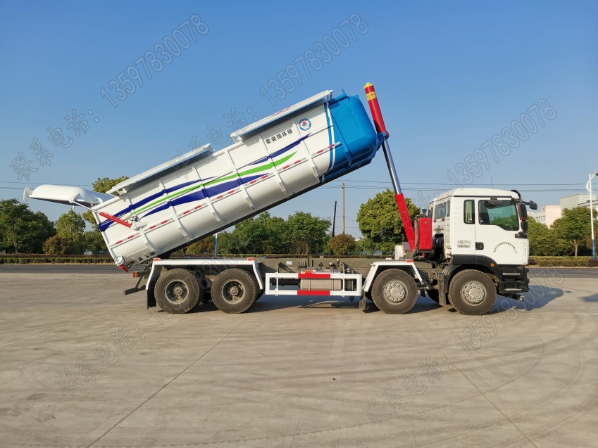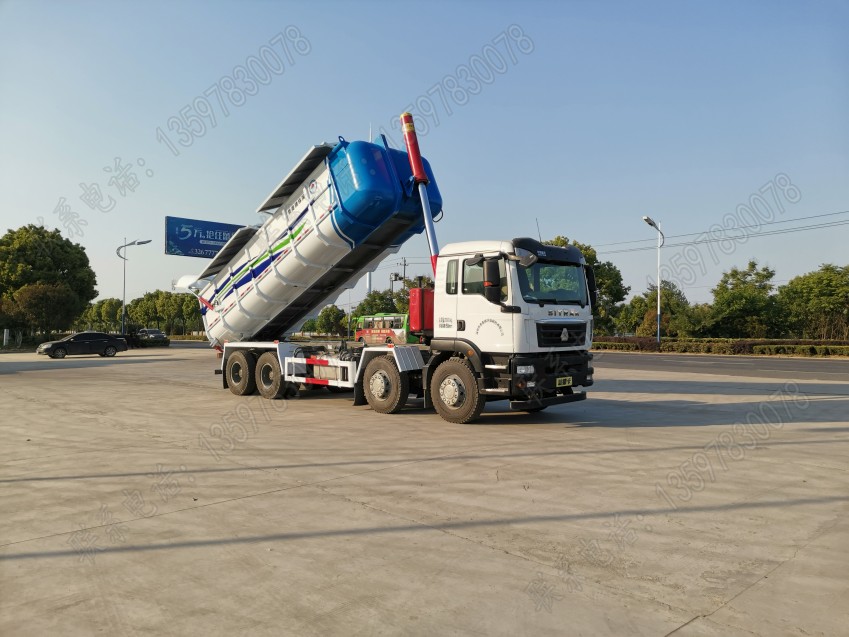密封煤渣運輸車,該車型全車液壓系統密封,防止運輸過程中揚塵撒漏情況,箱體容積26方,